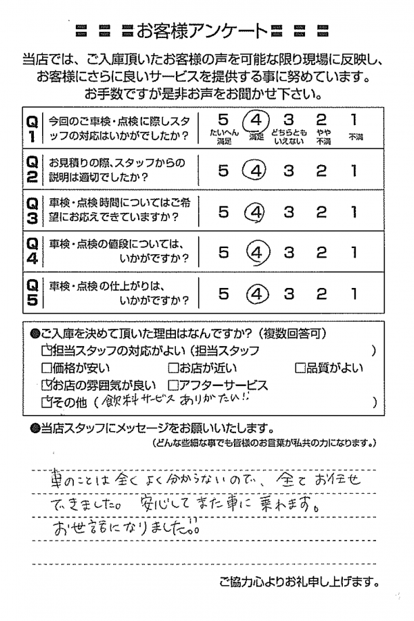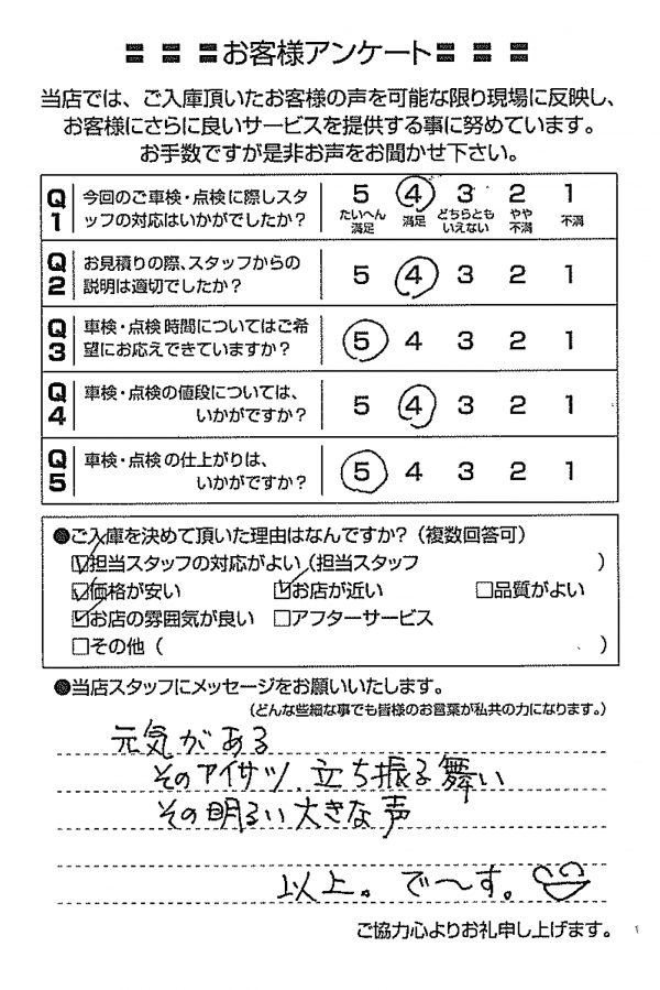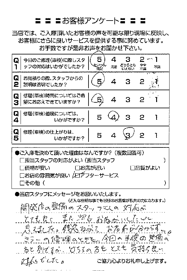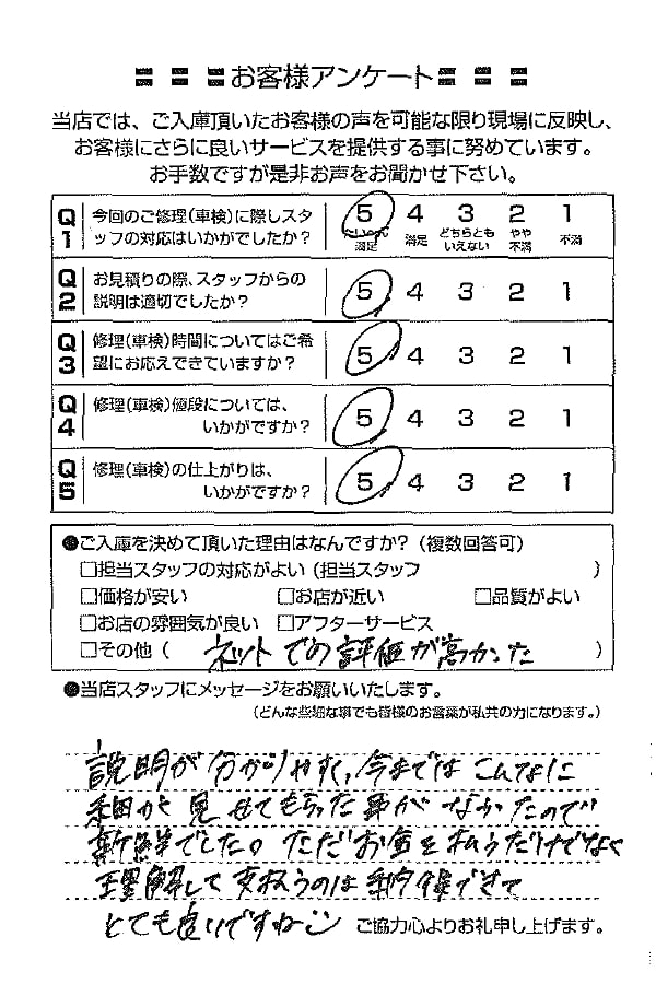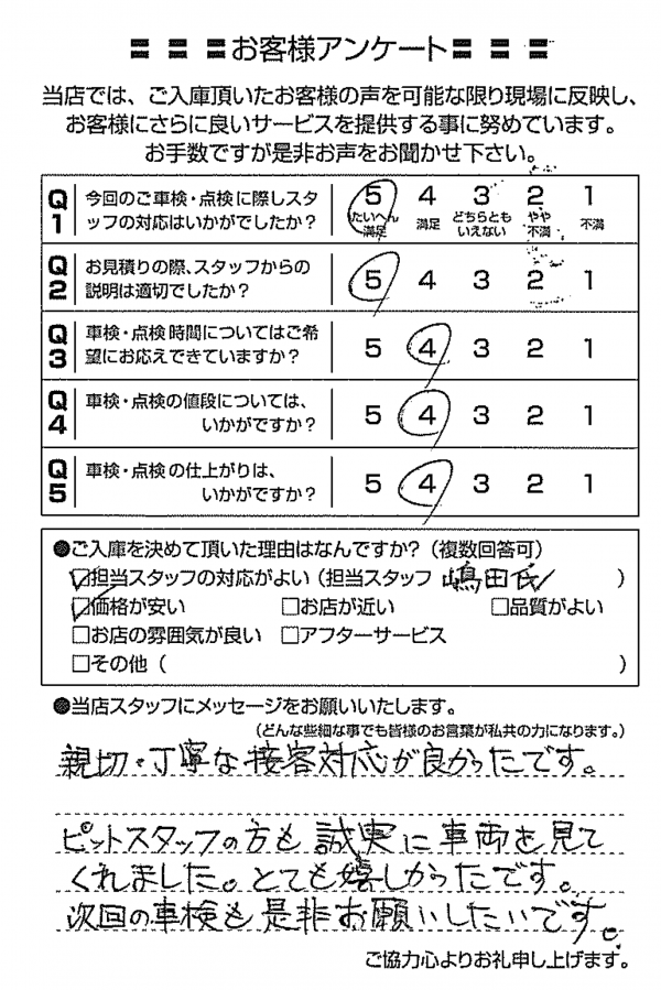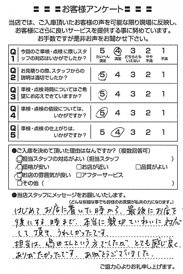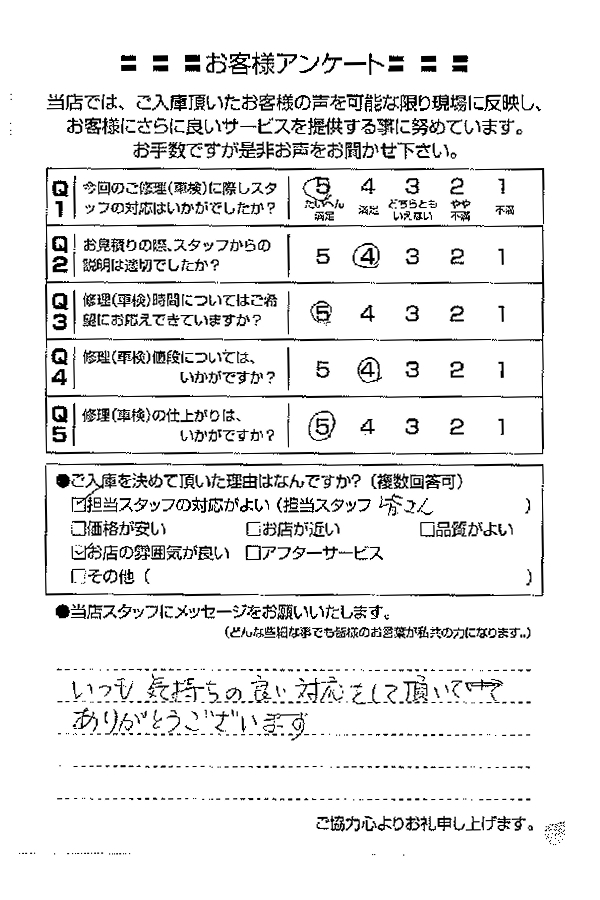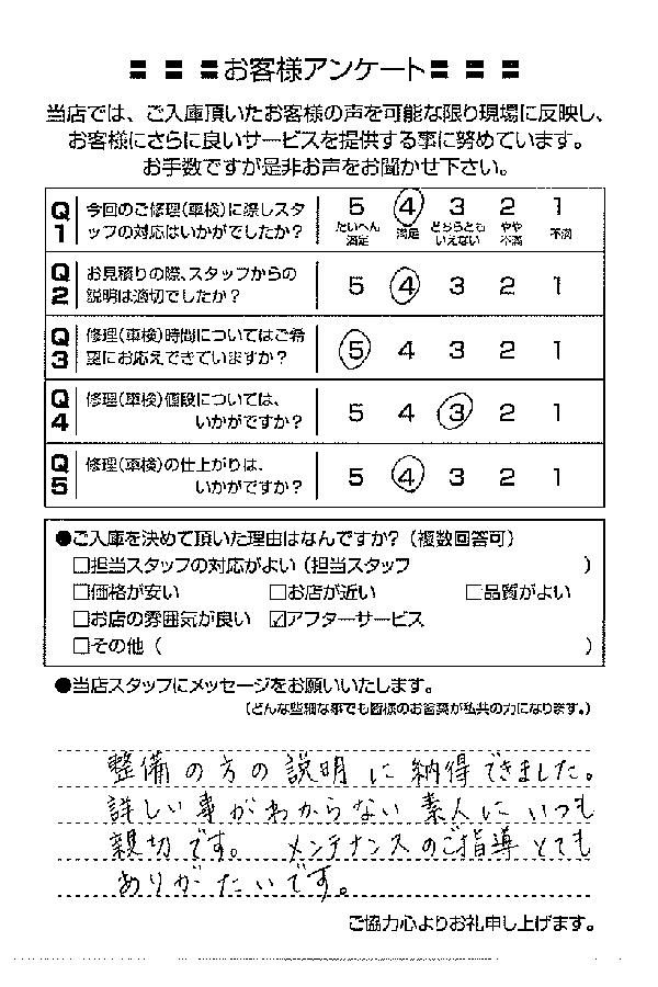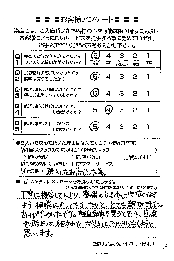整備の方が明るくて親切でした。 N様 |