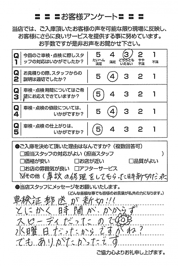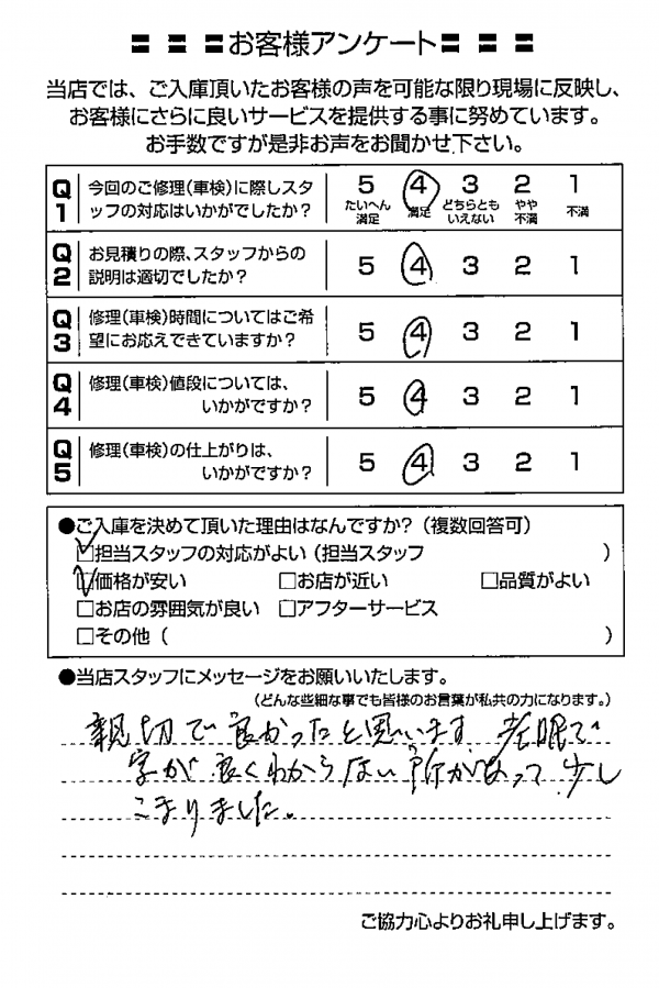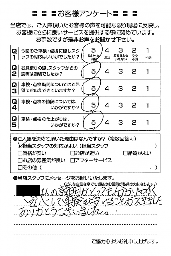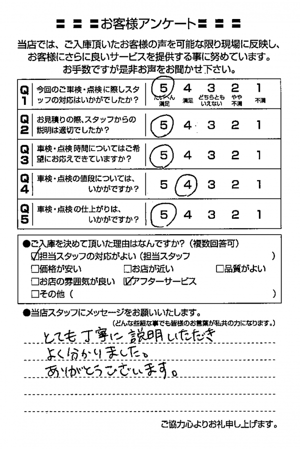 あまり車検のことが分からない私にも分かるように説明してくださり、とても良かったです。特に車検証について読み上げるとき「左側の○○」「上から何番目の」などと言ってくださったので、分かりやすかったです。希望する日をお伝えしたところ、後々の修理のことも考えて一週間早くした方がいいと言ってくださり少し早めにしたのですが、実際に修理をしたため、その判断がありがたかったです。 あわら市40代男性(K.O様) |