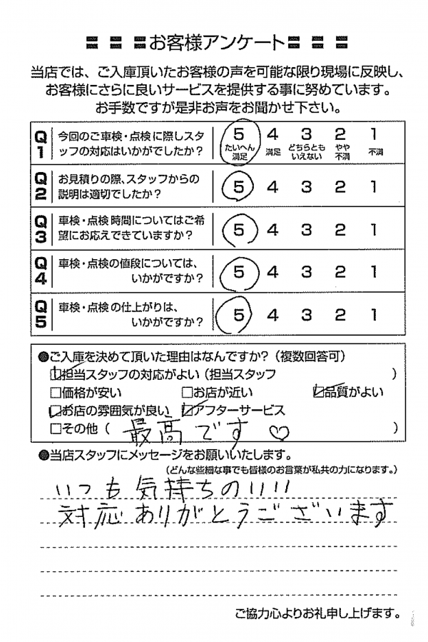 2回目の車検で利用させて頂きました。 T様 |